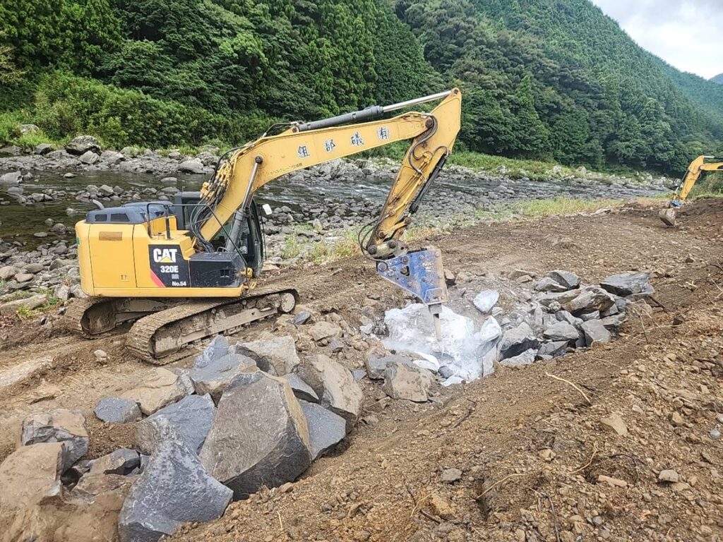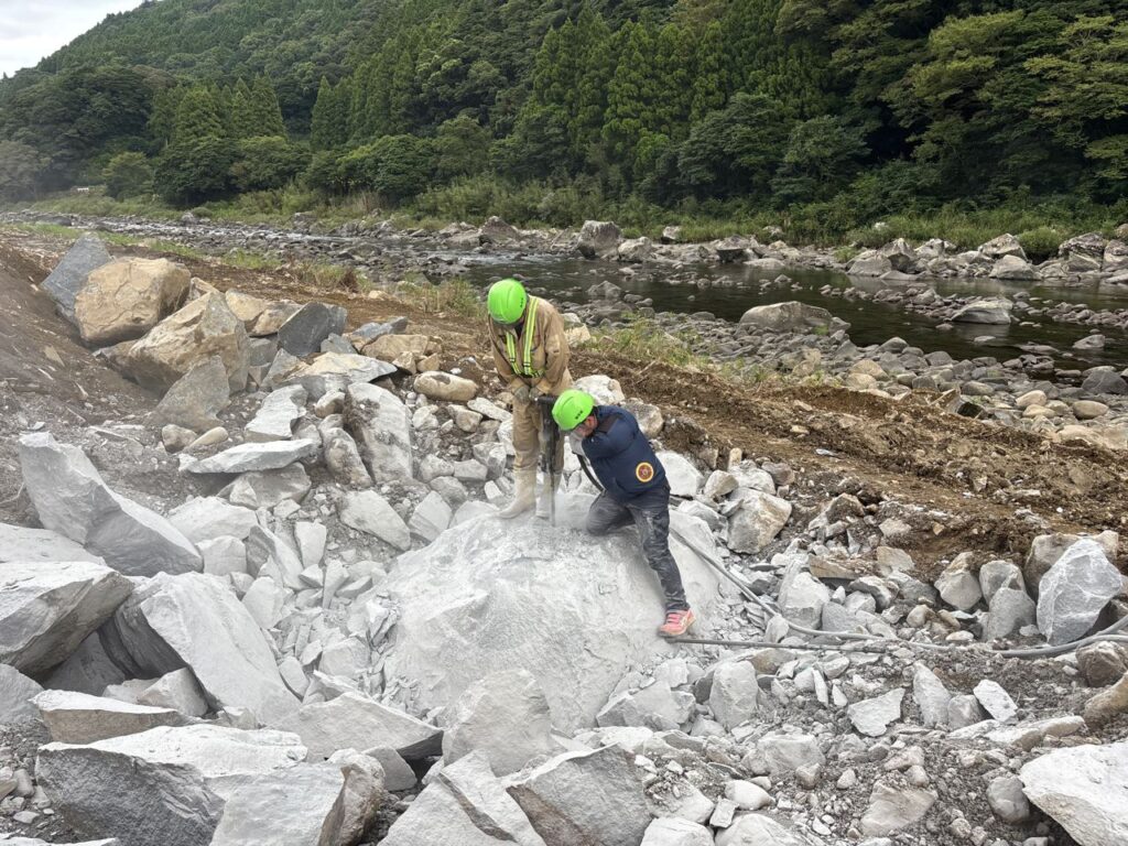 一つは、力技!「大型ブレーカー」です。バックホウの先に巨大なハンマーをつけて、「ドガガガーン!」と叩き割るんです。ものすごい音と振動で、岩がバラバラになっていく様子は、まさに岩との真剣勝負!
