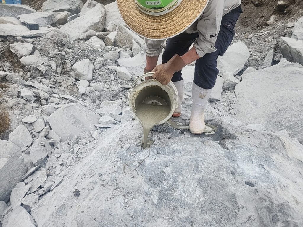 この薬剤が、ゆっくりと膨らんでいく力で、時間をかけて岩を内側からヒビ割れさせていくんですよ。大きな音や振動を出さずに、静かに、でも確実に岩を割っていく現場の人たちの知恵が光る作業なんです。