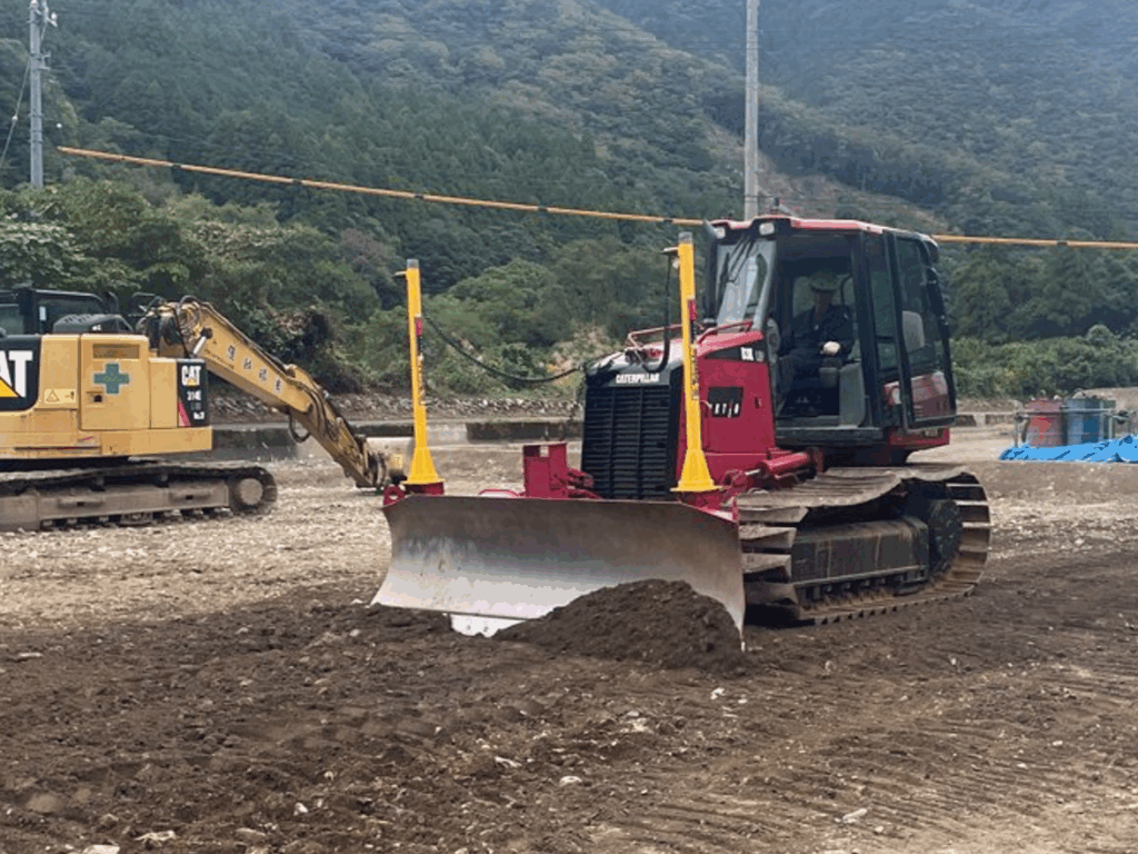 このマシンコントロールのブルドーザーは、田んぼや畑のデコボコした土を平らにする作業(基盤土や表土の仕上げ)をするんですが、なんと、機械が自分で高さをコントロールしてくれるんですって!