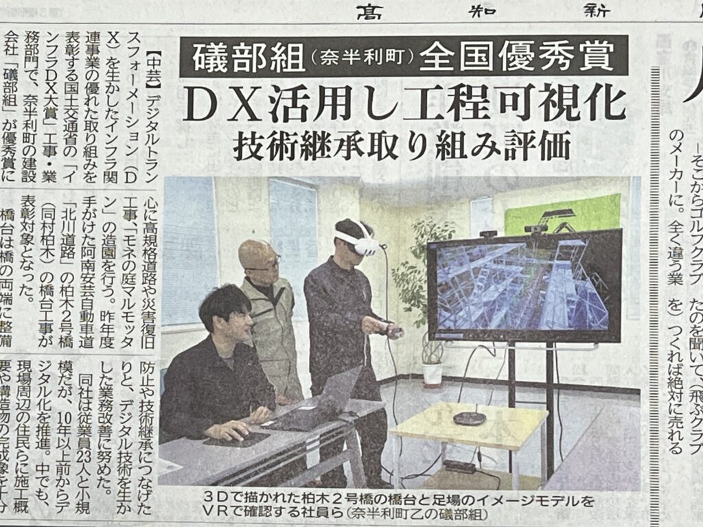 記事には、VRで橋のモデルを確認する社長、みやうちさん、そしてICT推進チーム長のモッちゃんの姿が! 「デジタル技術で技術継承を」という私たちの取り組みが、こうして形になって評価されるのは本当に嬉しいことですよね。