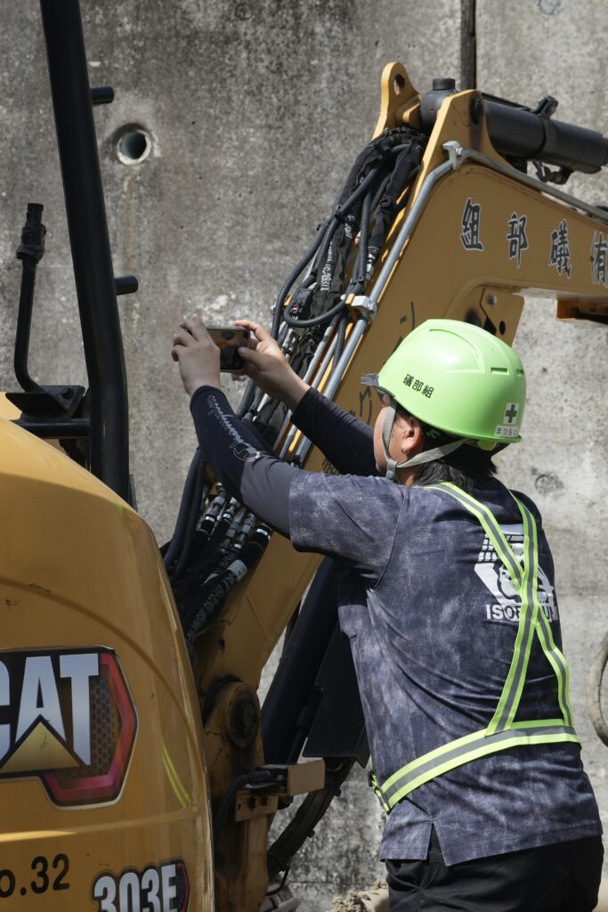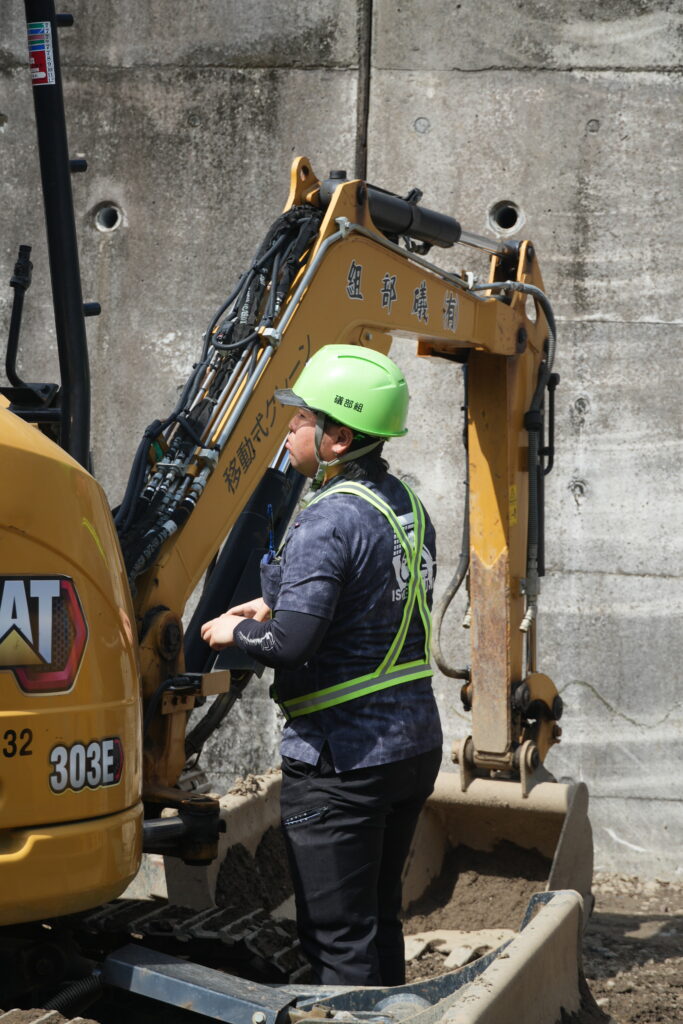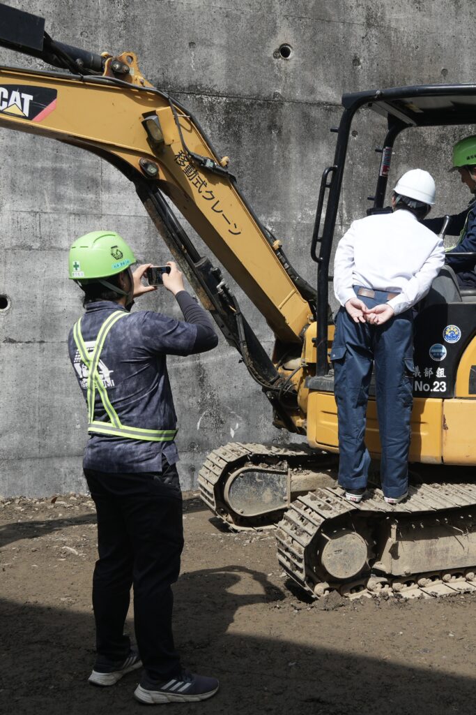 現場に到着して、アヤカがまず目にしたのは…… 重機のキャタピラの上に立ち、スマホを構える若手技術者のナッちゃんの姿でした。