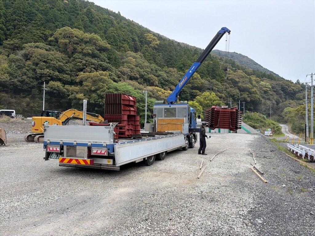 現場ノート ホーム 現場ノート CATEGORY ALL その他ちいさなことからコツコツとアヤカですトシ子ですモネの庭国道493号北川道路国道493号道路維持業務国道493号防災工事奈半利川河川災害復旧工事奈半利町発注工事安芸高校・礒部組連携授業小島ほ場整備工事森林管理道島日浦線橋の補修とか補強とかをする工事瀬戸ヶ谷川砂防メンテナンス工事琵琶ヶ谷砂防工事社員インタビュー社員研修須川林地荒廃防止工事 CATEGORY その他ちいさなことからコツコツとアヤカですトシ子ですモネの庭国道493号北川道路国道493号道路維持業務国道493号防災工事奈半利川河川災害復旧工事奈半利町発注工事安芸高校・礒部組連携授業小島ほ場整備工事森林管理道島日浦線橋の補修とか補強とかをする工事瀬戸ヶ谷川砂防メンテナンス工事琵琶ヶ谷砂防工事社員インタビュー社員研修須川林地荒廃防止工事 2026/4/14 国道493号北川道路 北川村和田 まもなく根固めブロックの製作が始まります。 根固めブロックの型枠が入ってきました。 とりあえず第一陣として10組。 来週はじめには第二陣として50組が到着 トータル60組で月末から製作をはじめます。 つくる場所は 北川村和田地区 写真上の方では大型ブロック積みが絶賛進行中です。 製作ヤードの使用計画はこんな感じ。 画像上の方でブロックをつくり できたモノを下の方(川側)に仮置きしていきます。 高規格道路の足元を保護する根固めブロック製作 まもなく開始です! (みやうち)