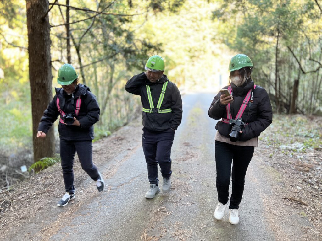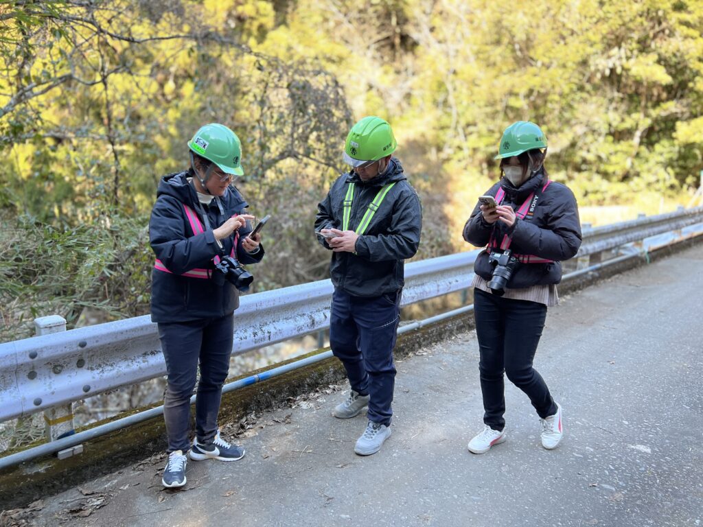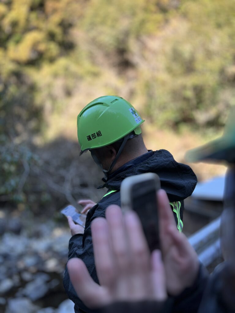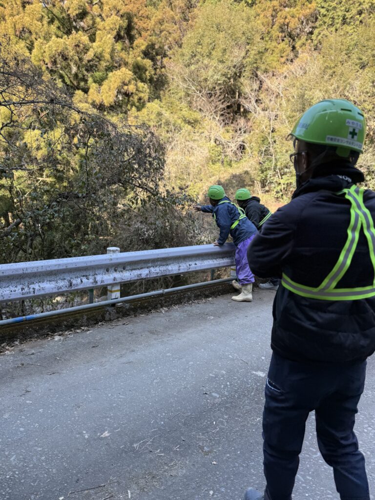 ふたりがガードレールから身を乗り出して何やら取ろうとしています。