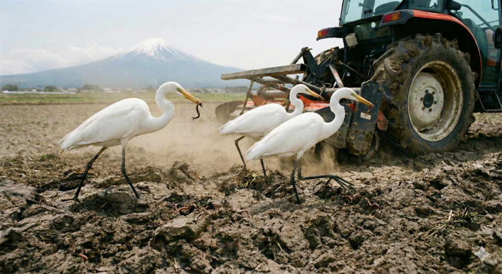 シラサギは頼もしからずや 土に立ち 豊作願い石を拾いぬ