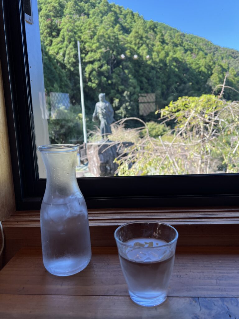 陽光に照らされてすっくと立つ慎太郎さんをながめながら冷やをいっぱい。